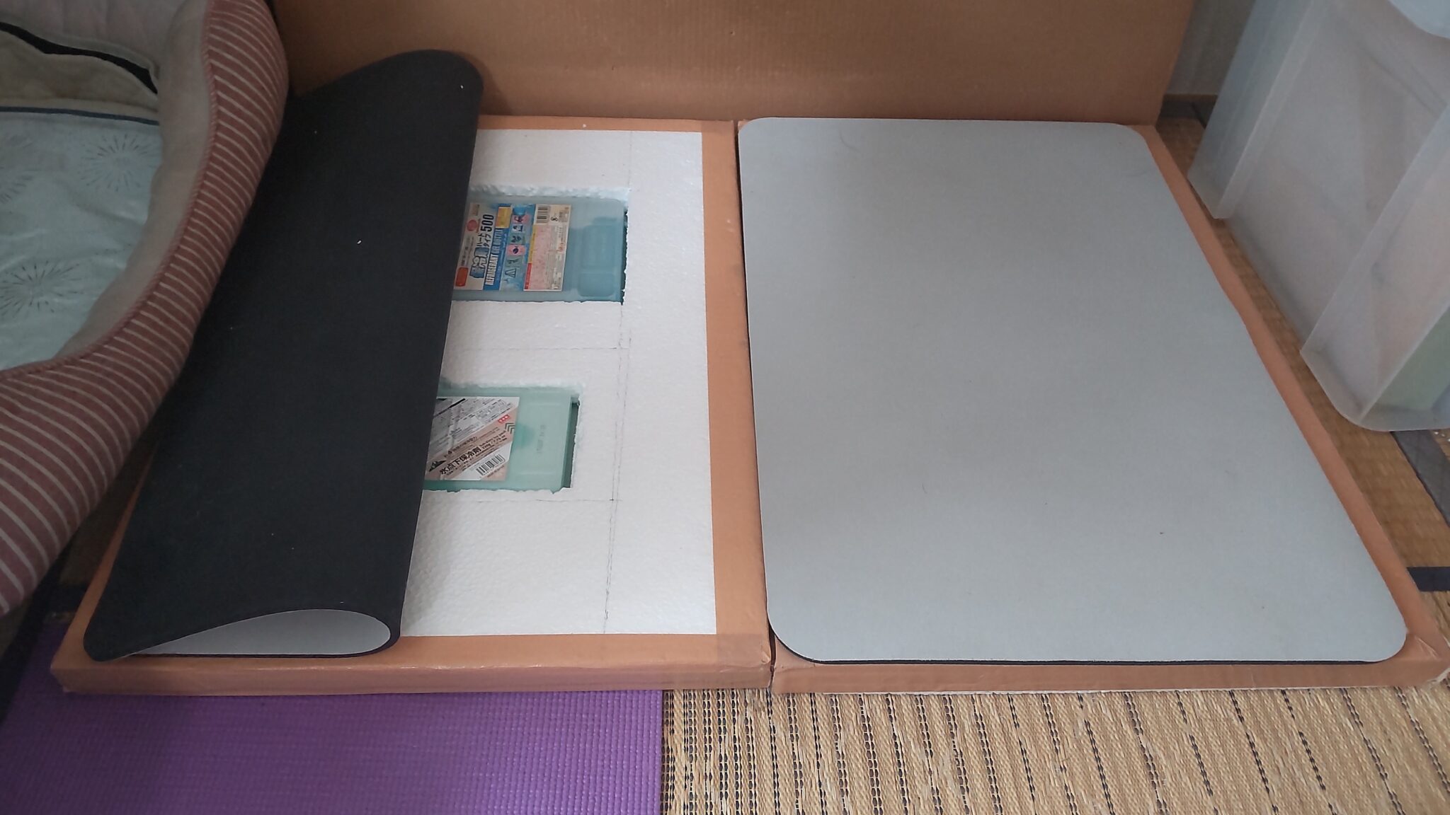 - 加工した発泡なんでも板を2枚を切った保冷アルミパックの上に置きます。(穴の位置にアルミパックが来るようにセットします)