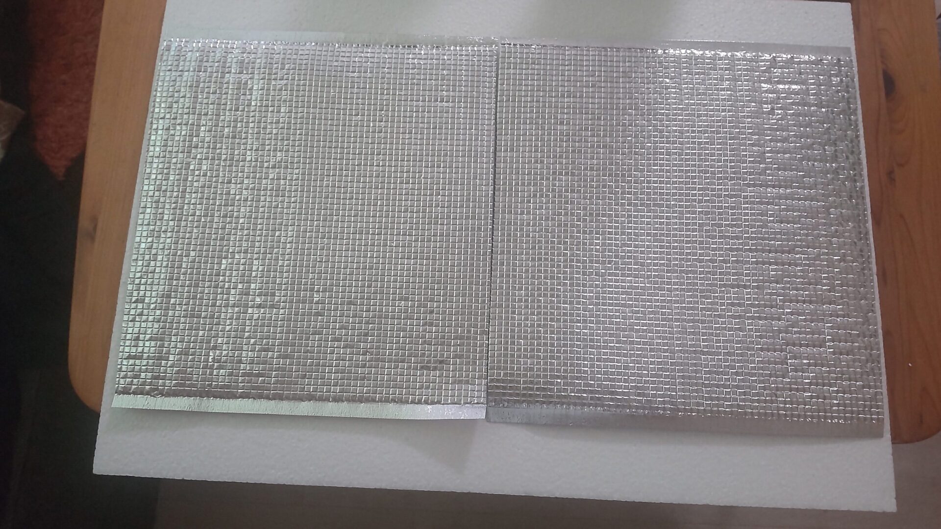 - 保冷アルミパックを切って、未加工の発砲なんでも板の上に置きます。(加工した穴の位置の下にくるように置きます。)