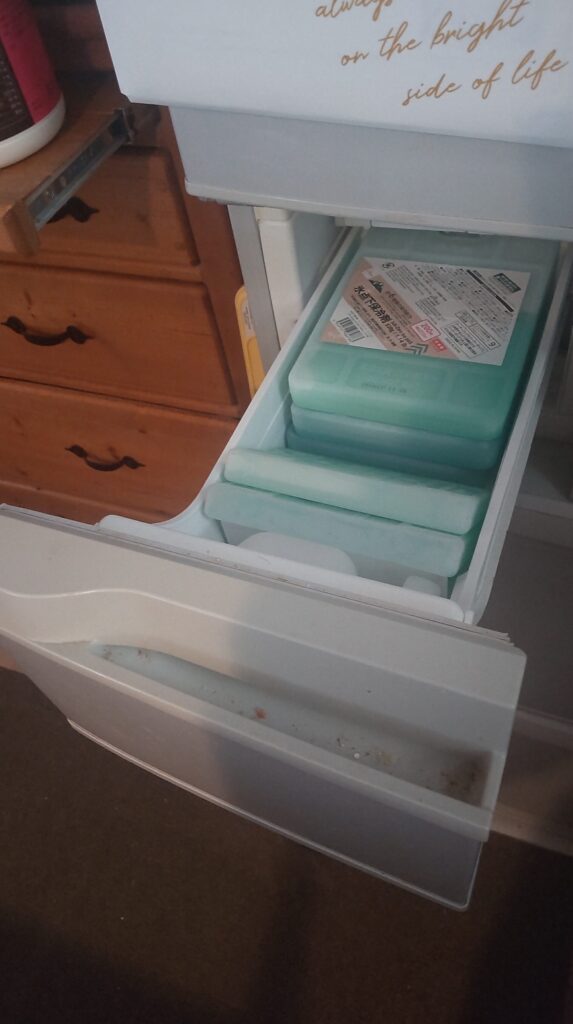 ・保冷剤を冷凍する必要があるため、冷凍庫の中に保冷剤を入れるスペースを確保する必要があります。我が家では、氷を入れる引き出しを利用し、1日2回交換しています。
